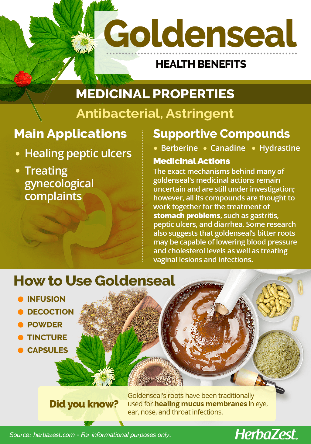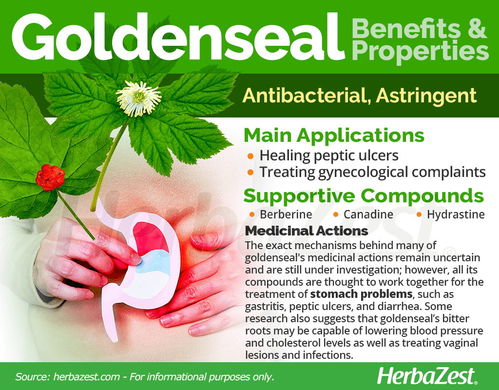 Goldenseal has shown potential for treating vaginal lessions3, and it can be used internally to treat gastritis, peptic ulcers, and diarrhea.