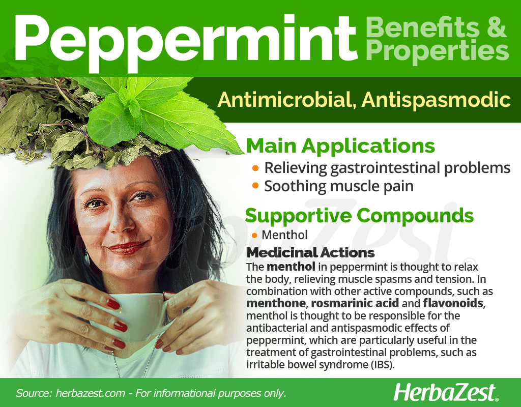 Relieving gastrointestinal problems. The antispasmodic properties of peppermint has been traditionally used to soothe stomach aches, nausea, and irritable bowel syndrome (IBS).