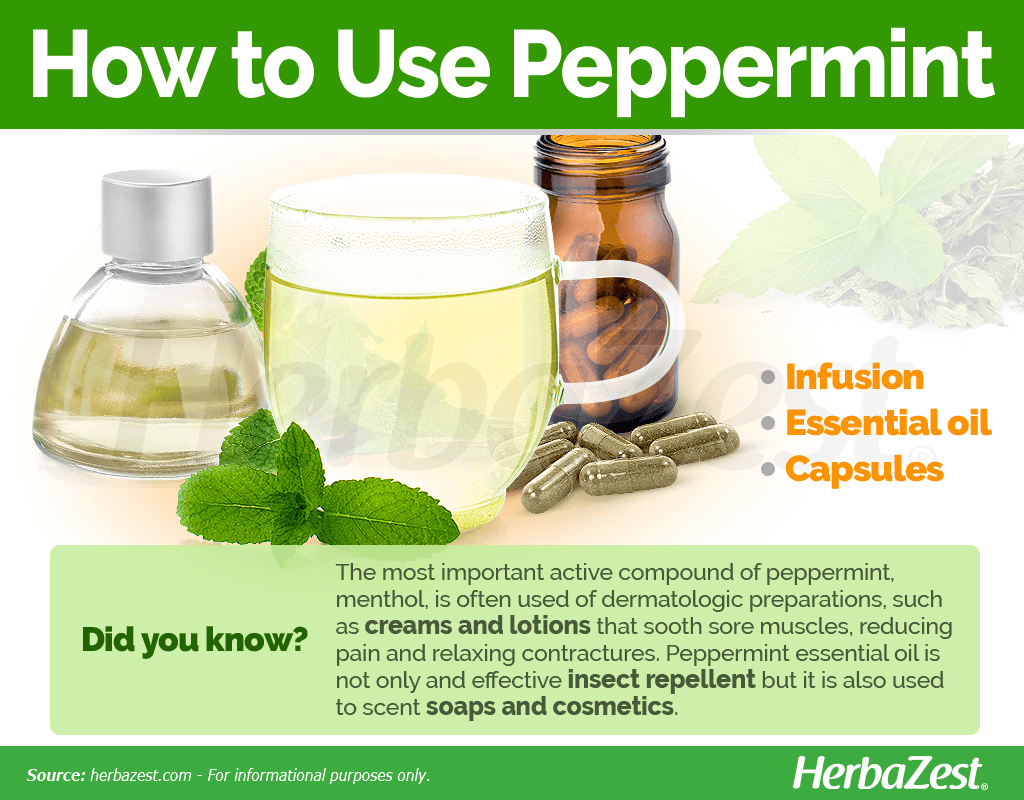 Infusion. Peppermint leaves can be easily found fresh and dried (both loose and in tea bags). It is usually drank as a hot infusion to reap its digestive and antispasmodic benefits.