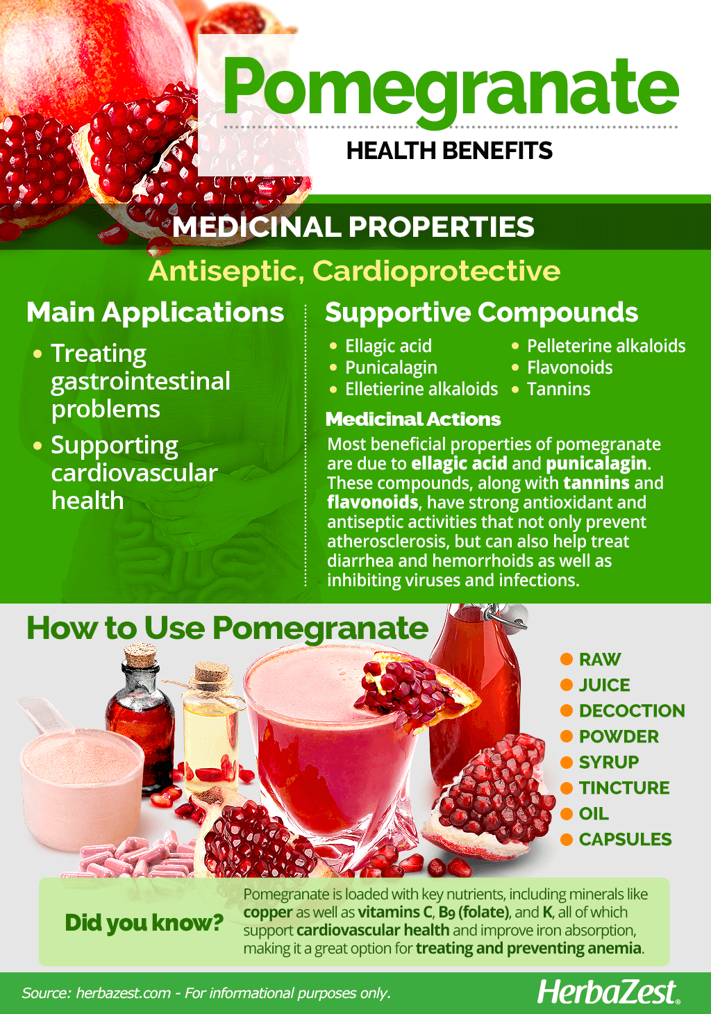 Additional medicinal uses of pomegranate include preventing and treating diabetes, as well as infections such as herpes simplex, flu, and gum disease.