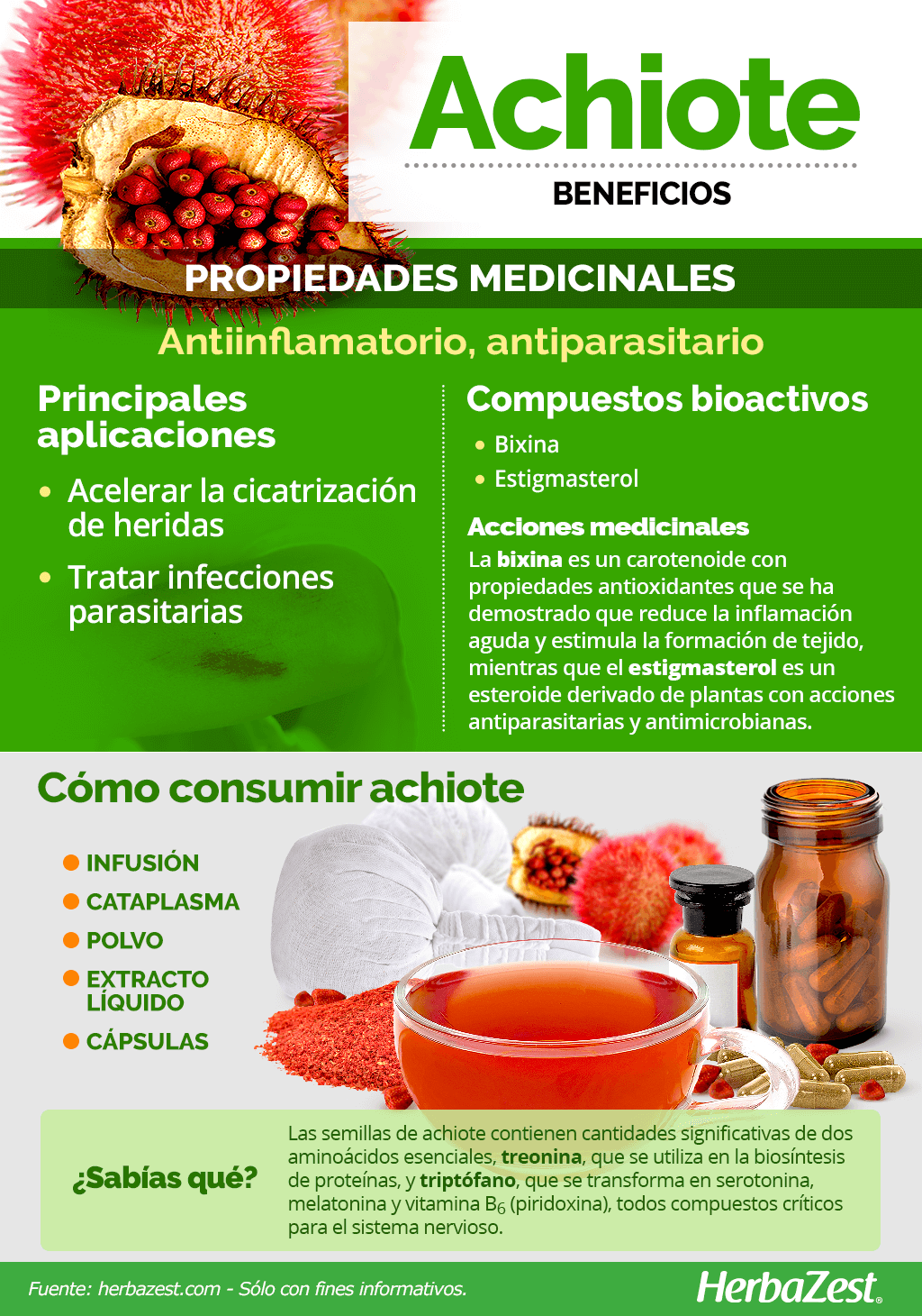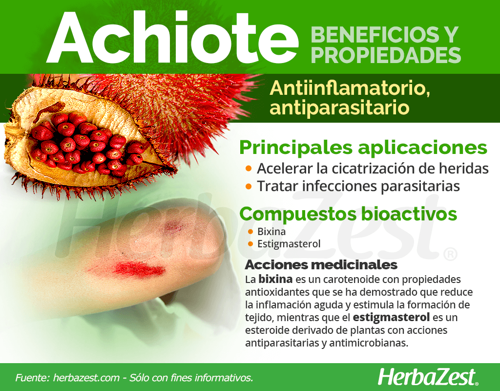 Tratar infecciones parasitarias. El achiote se usa popularmente para eliminar parásitos y parece ser particularmente efectivo para aliviar los síntomas de la malaria.