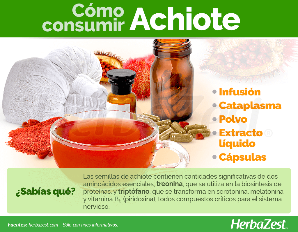 Polvo. El polvo o pasta de semillas de achiote se utiliza como condimento y colorante, especialmente en la comida latinoamericana. No está claro si la cantidad que normalmente se consume en recetas culinarias es suficiente para proporcionar beneficios antiinflamatorios.