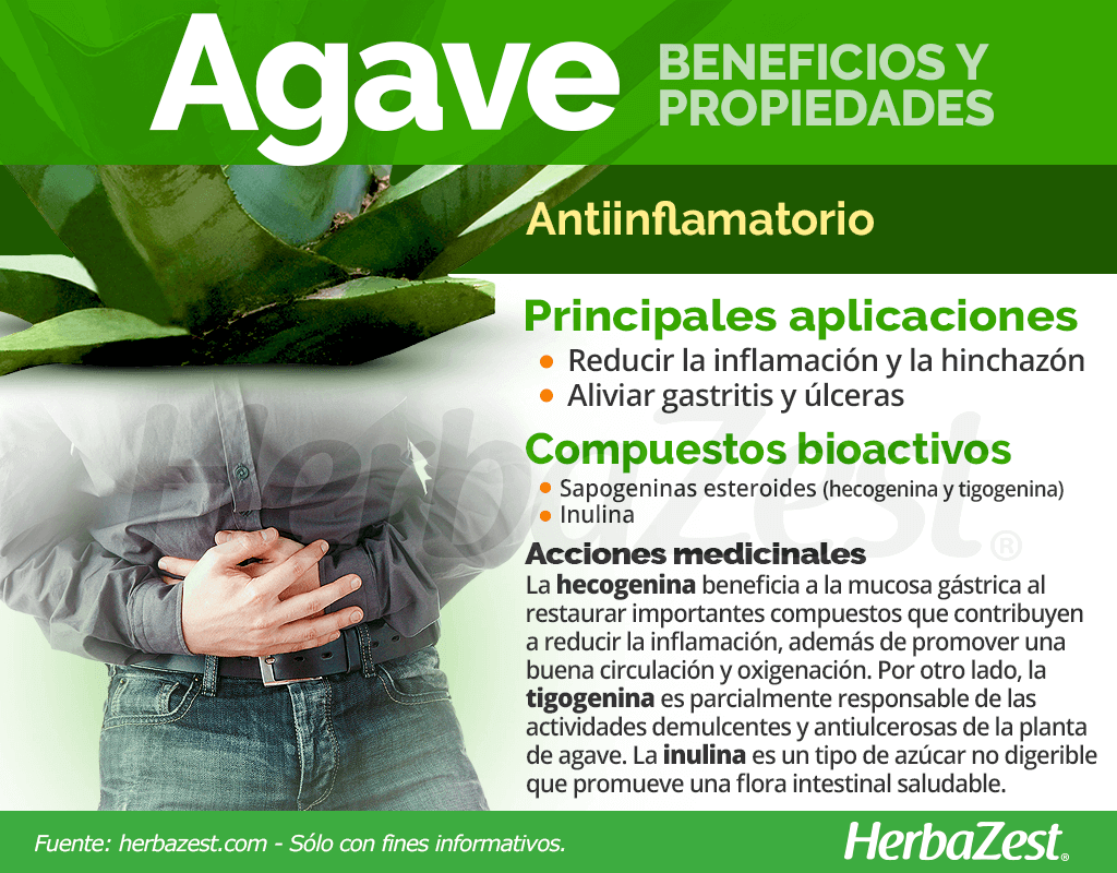 Aliviar gastritis y úlceras. Debido a sus propiedades antiinflamatorias demulcentes, la savia gelatinosa del agave es un remedio útil para la gastritis y las úlceras estomacales.