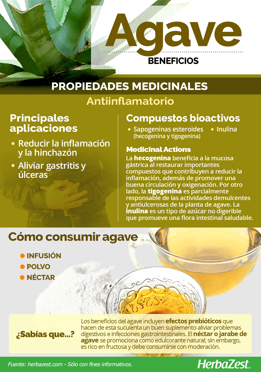 Infusión. Con las hojas secas de la planta de agave se puede preparar una bebida caliente, a fin de extraer sus propiedades antiinflamatorias y gastroprotectoras. La infusión de agave también se puede aplicar tópicamente para desinfectar heridas superficiales e irritaciones de la piel.