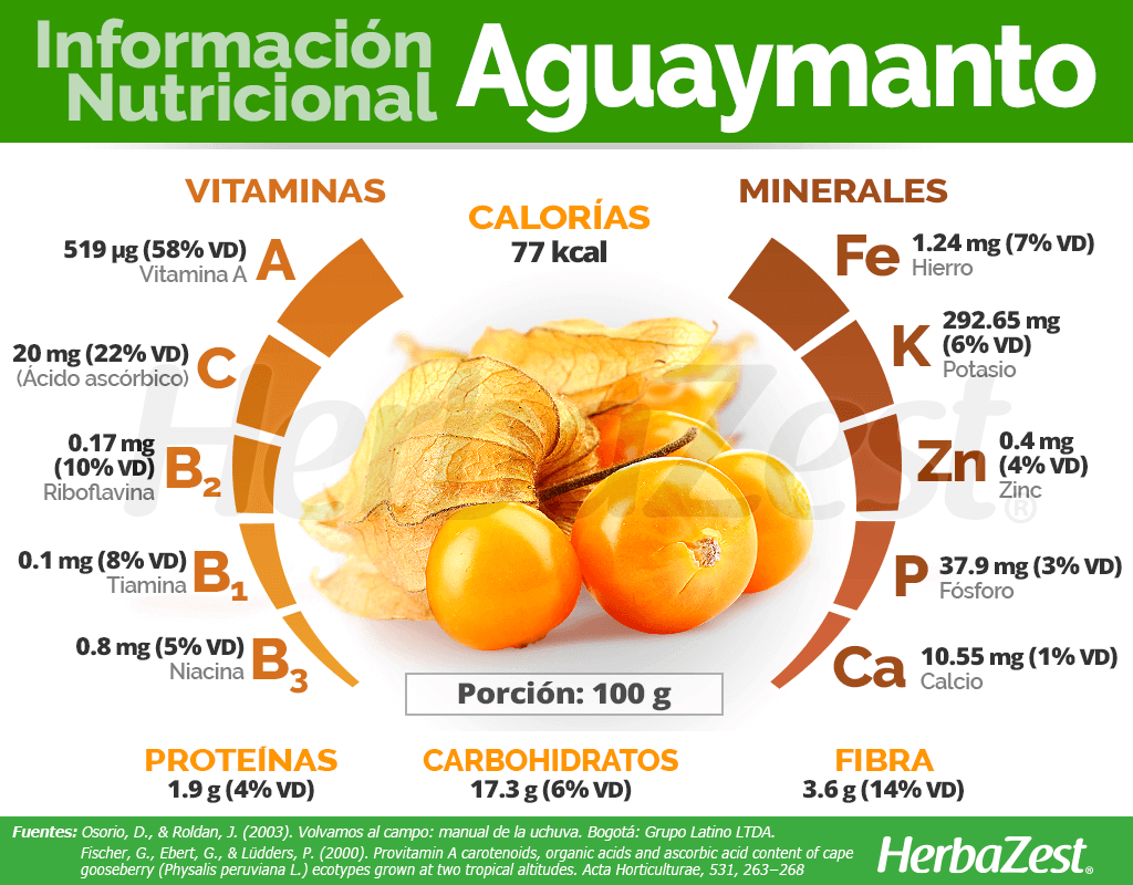 100 GRAMOS DE BAYAS DE AGUAYMANTO PROPORCIONAN APROXIMADAMENTE 77 CALORÍAS, ASÍ COMO 4% Y 14% DE LOS VALORES DIARIOS DE PROTEÍNA Y FIBRA, RESPECTIVAMENTE.