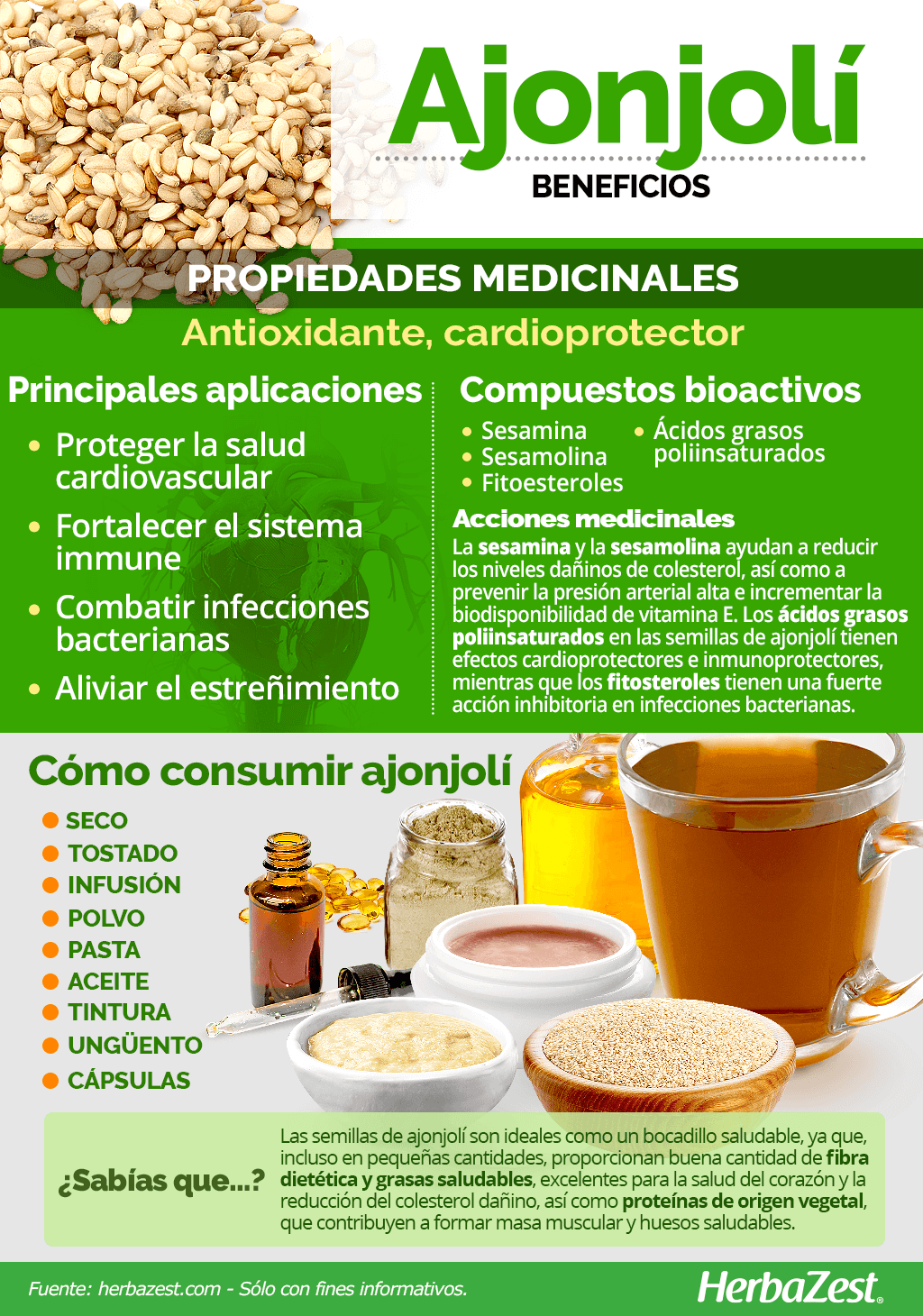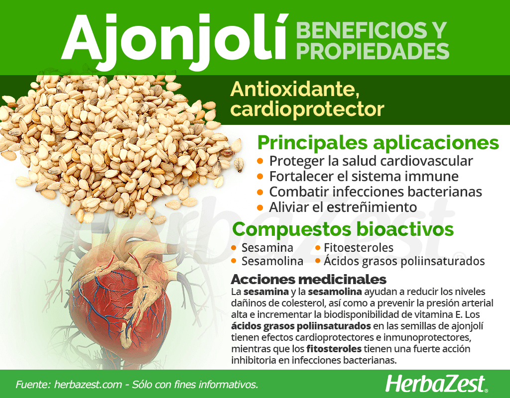 Proteger la salud cardiovascular. Las propiedades del ajonjolí incluyen notables efectos hipolipidémicos y antihipertensivos, que han demostrado reducir los niveles de colesterol dañino, así como controlar la presión arterial, ayudando así a tratar y prevenir enfermedades cardiovasculares.