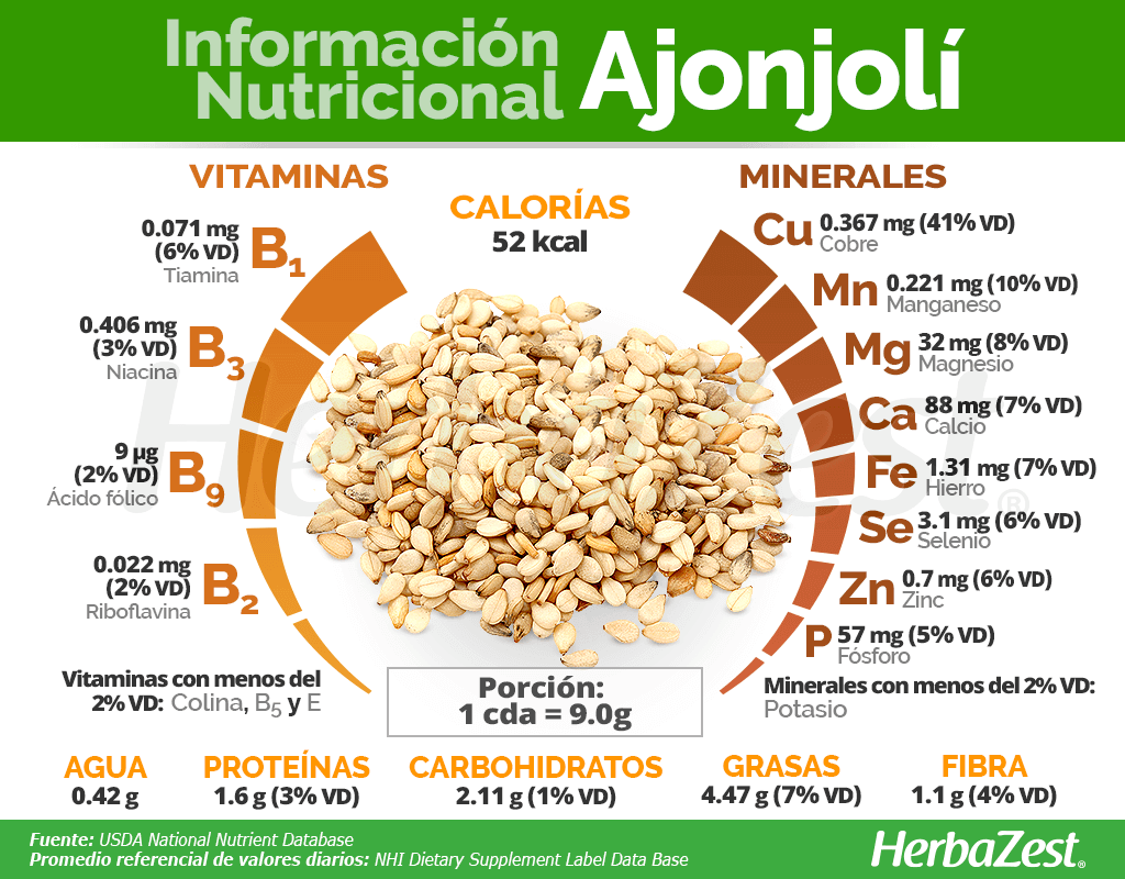 UNA CUCHARADA DE SEMILLAS DE AJONJOLÍ (9 GRAMOS) PROPORCIONA 52 CALORÍAS, ASÍ COMO UN 3%, 7% Y 4% DEL VALOR DIARIO DE PROTEÍNAS, GRASAS Y FIBRA DIETÉTICA, RESPECTIVAMENTE.