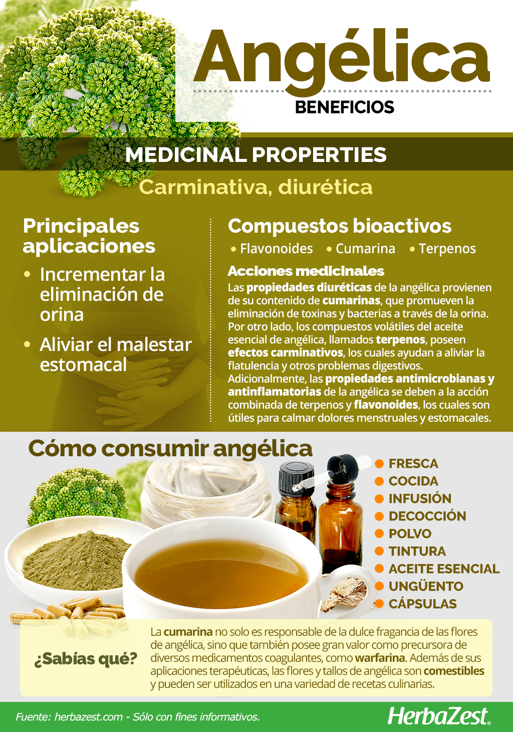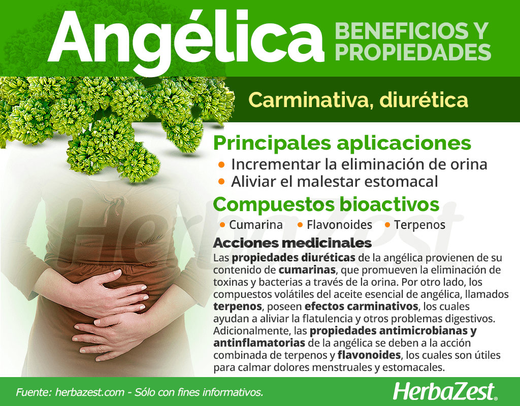 Aliviar las molestias estimacales. Las propiedades carminativas de la angélica pueden ayudar a aliviar la indigestión, la hinchazón y la flatulencia, y su sabor amargo es útil para estimular el apetito.
