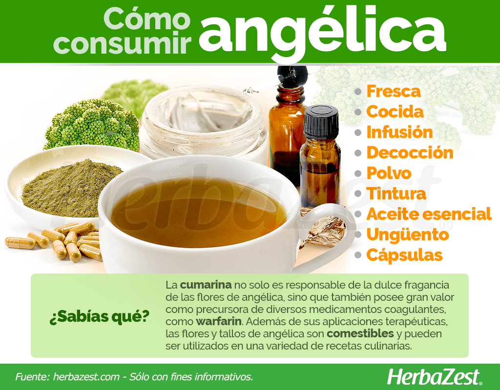 El aceite extraído de los frutos y raíces de la angélica es rico en cumarina, un compuesto fitoquímico con propiedades diaforéticas y diuréticas.2