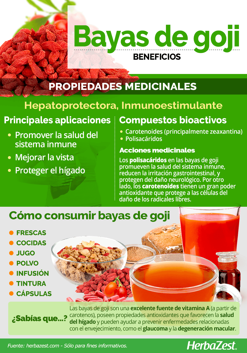 Promover la inmunidad. Estudios preliminares sugieren que las bayas de goji pueden ejercer un efecto estimulante sobre la función inmune, protegiendo así el cuerpo humano contra patógenos externos, como virus y bacterias dañinas.