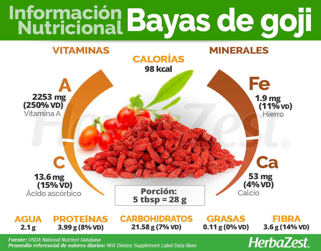 CINCO CUCHARADAS (ALREDEDOR DE 28 GRAMOS) DE BAYAS DE GOJI SECAS PROPORCIONAN 98 CALORÍAS LIBRES DE GRASA, ASÍ COMO 8%, 7% Y 14% DEL VALOR DIARIO DE PROTEÍNAS, CARBOHIDRATOS Y FIBRA DIETÉTICA, RESPECTIVAMENTE.