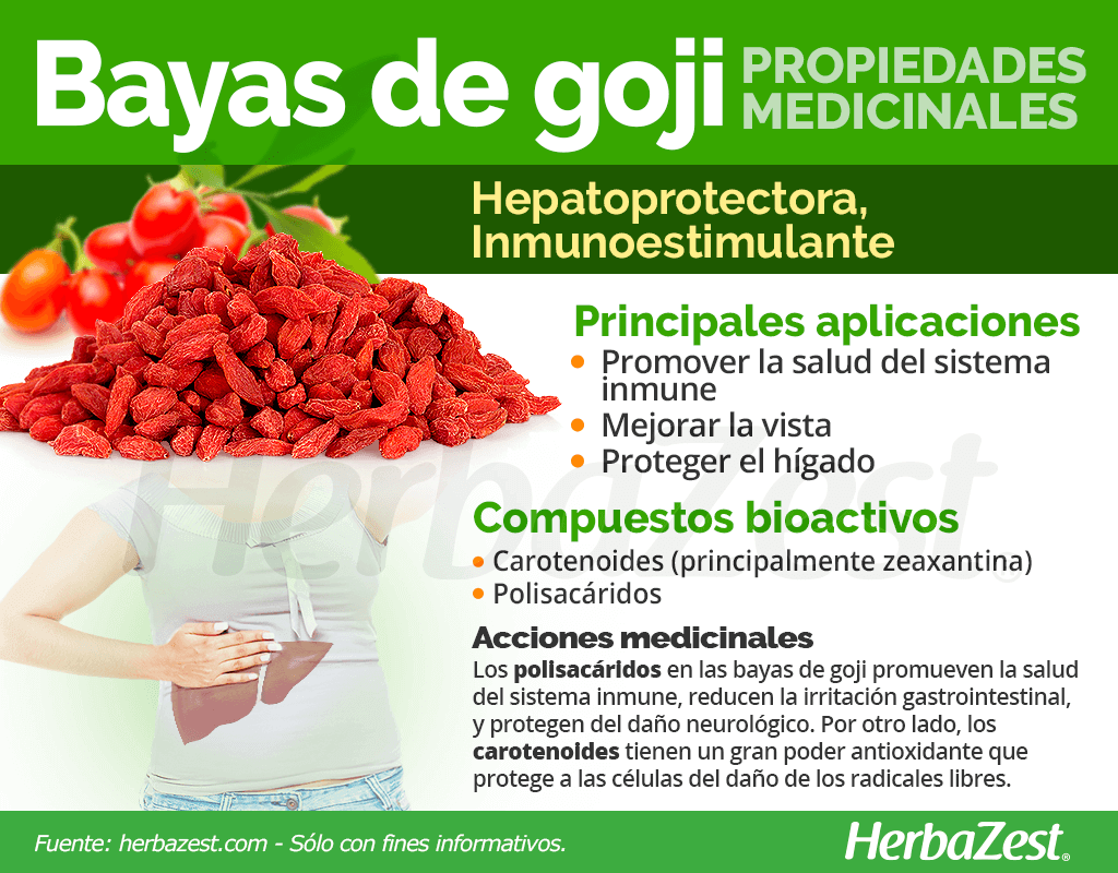 Polisacáridos y carotenoides (especialmente la zeaxantina) son los principales compuestos activos responsables de los beneficios de las bayas de goji. Los polisacáridos promueven las funciones del sistema inmune, reducen la irritación gástrica y protegen contra el daño neurológico, mientras que los carotenoides son antioxidantes que protegen a las células de los radicales libres y reparan el daño causado por el estrés oxidativo.