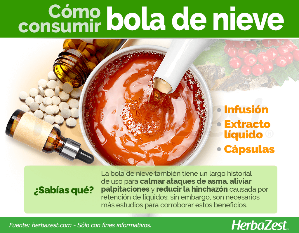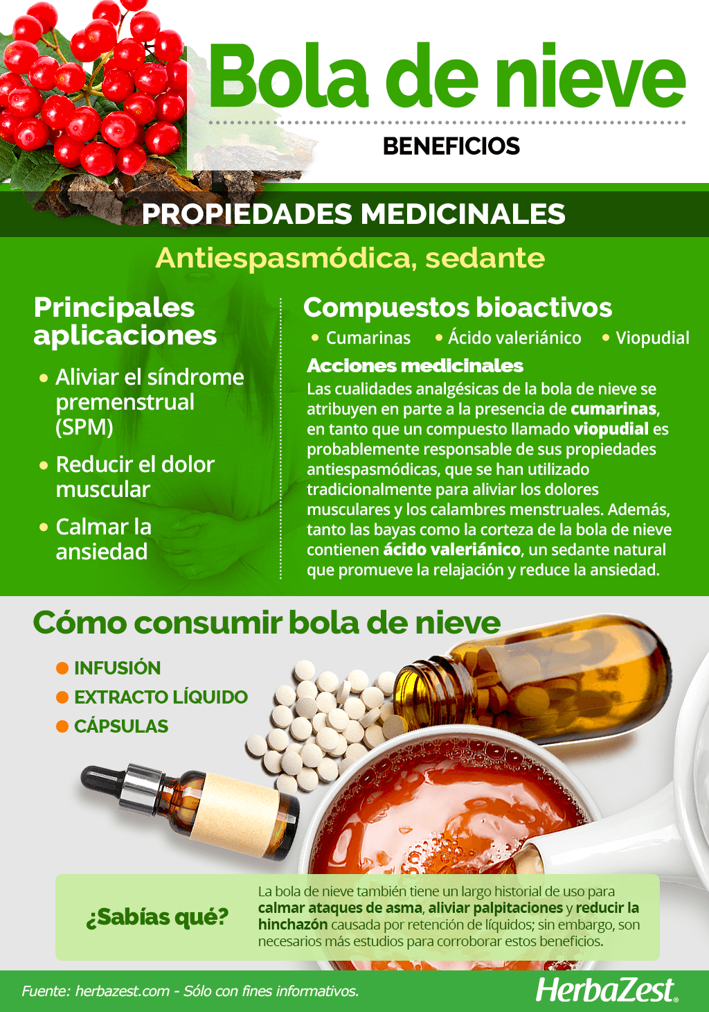 Gracias a sus propiedades antiespasmódicas, las bayas y corteza de la bola de nieve se han utilizado tradicionalmente durante el embarazo, con el fin de prevenir abortos y partos prematuros. Además, la bola de nieve se puede utilizar para calmar ataques de asma y aliviar palpitaciones, así como para reducir la hinchazón causada por la retención de líquidos.