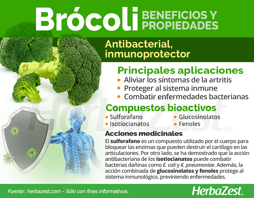 Aliviar los síntomas de la artritis. Se ha demostrado que el brócoli retarda el deterioro del cartílago en las articulaciones, que es una de las razones del dolor y el aumento de la debilidad en los adultos a medida que envejecen.