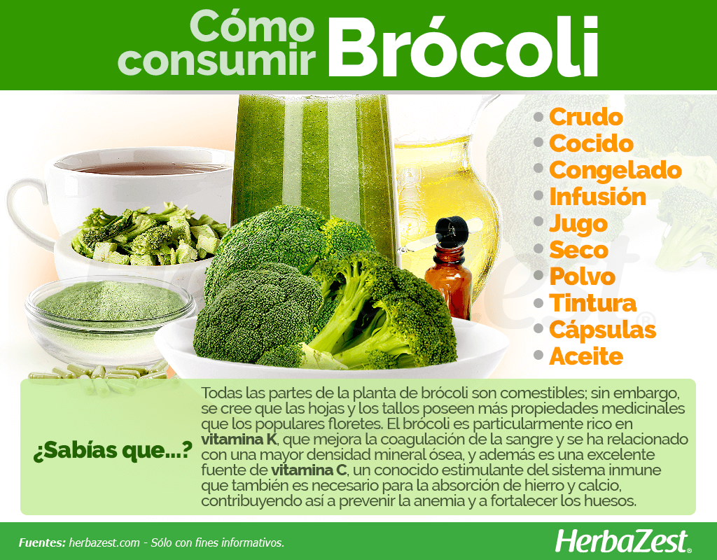 Tintura. Una preparación menos común, la tintura o extracto es una forma alternativa. Esta preparación popular, a menudo hecha de brotes, concentra las propiedades del brócoli. Se pueden agregar pocas gotas a un vaso de agua, así como a los batidos y otras bebidas.