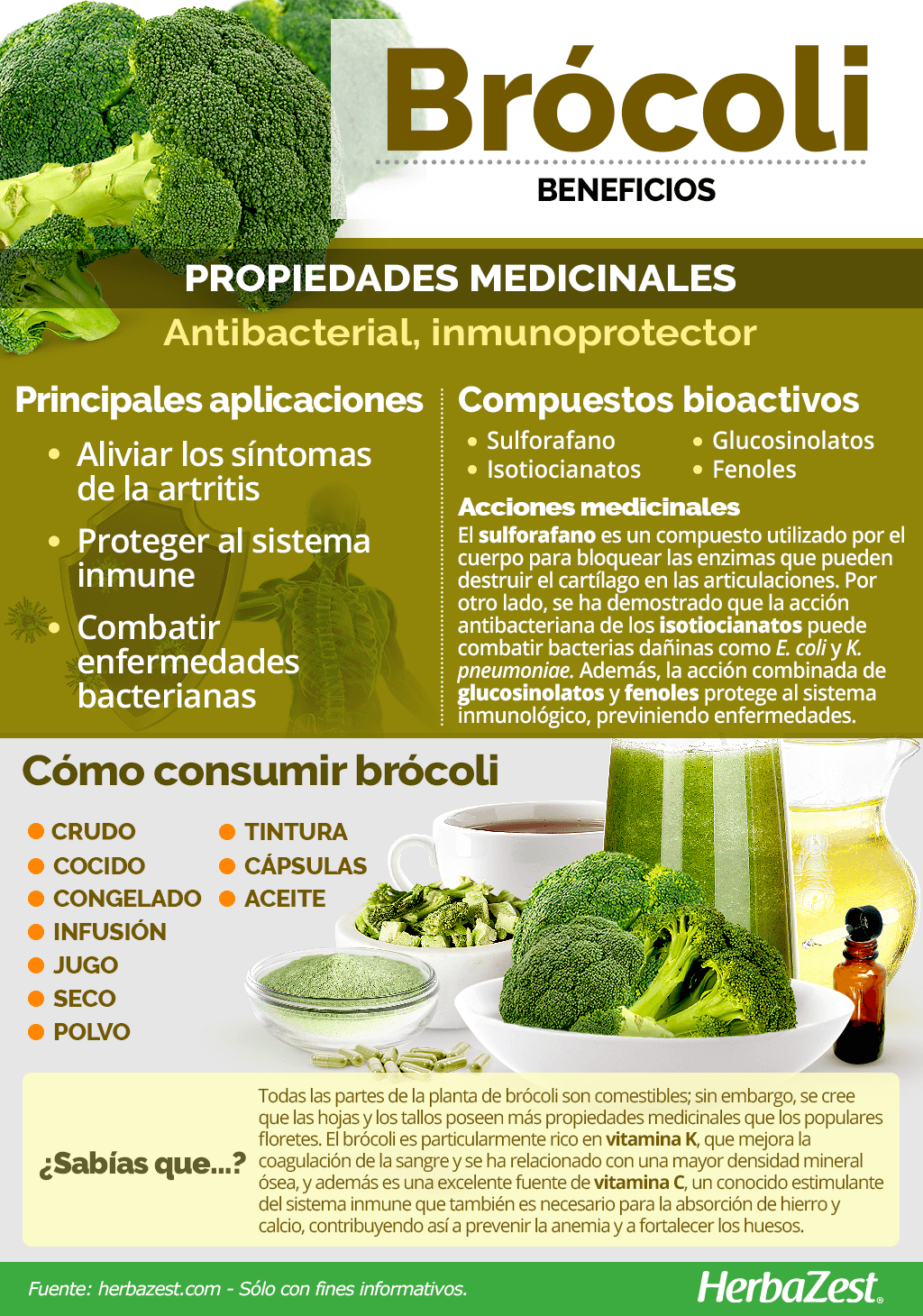 El brócoli ha sido un alimento básico para la humanidad desde la antigüedad, y es ampliamente conocido por sus beneficios nutricionales; sin embargo, las propiedades del brócoli también se han usado tradicionalmente para tratar varias afecciones. Algunos de los usos medicinales del brócoli han sido corroborados por estudios científicos, siendo los más importantes: