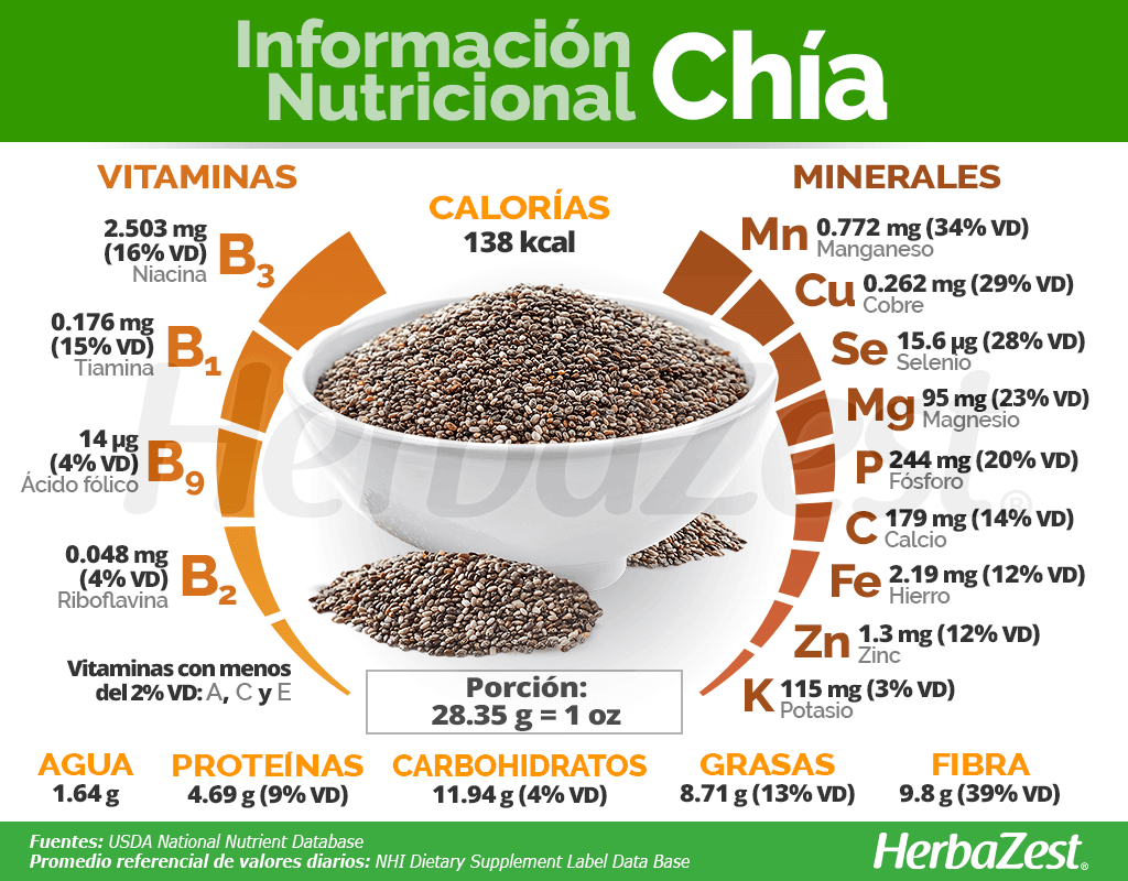 UNA ONZA DE SEMILLAS DE CHIA (28,35 G) PROPORCIONA 138 CALORÍAS Y UN IMPRESIONANTE 39% DEL VALOR DIARIO DE FIBRA DIETÉTICA.