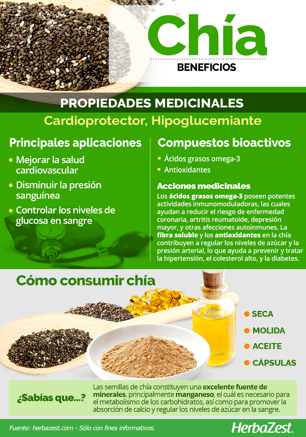 Controlar los niveles de glucosa en sangre. El alto contenido de fibra dietética en las semillas de chía es posiblemente una de las razones por las cuales su consumo puede ayudar en el tratamiento de la diabetes.