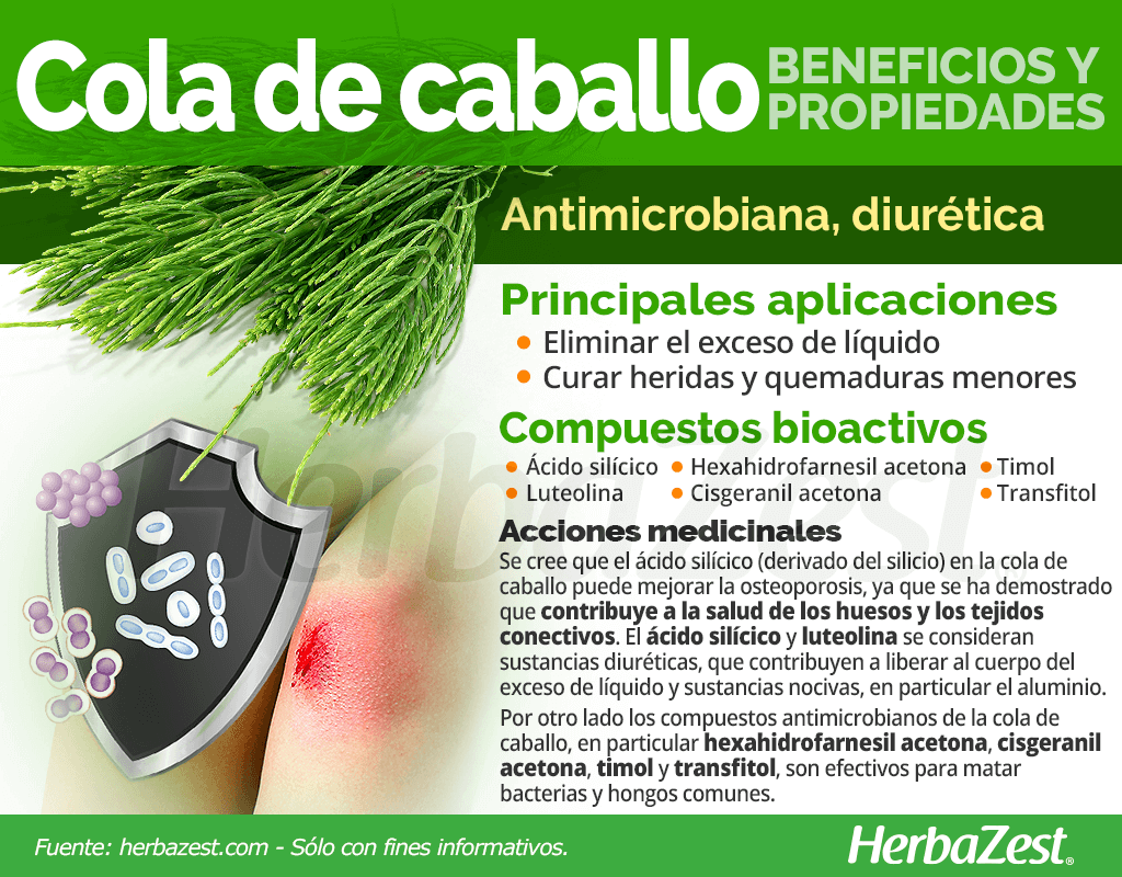 Curar heridas y quemaduras menores. Aplicada tópicamente, la cola de caballo se ha utilizado tradicionalmente para promover la curación de pequeñas lesiones.