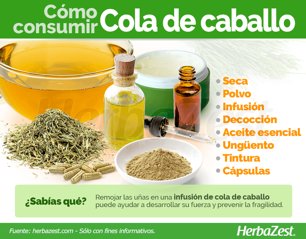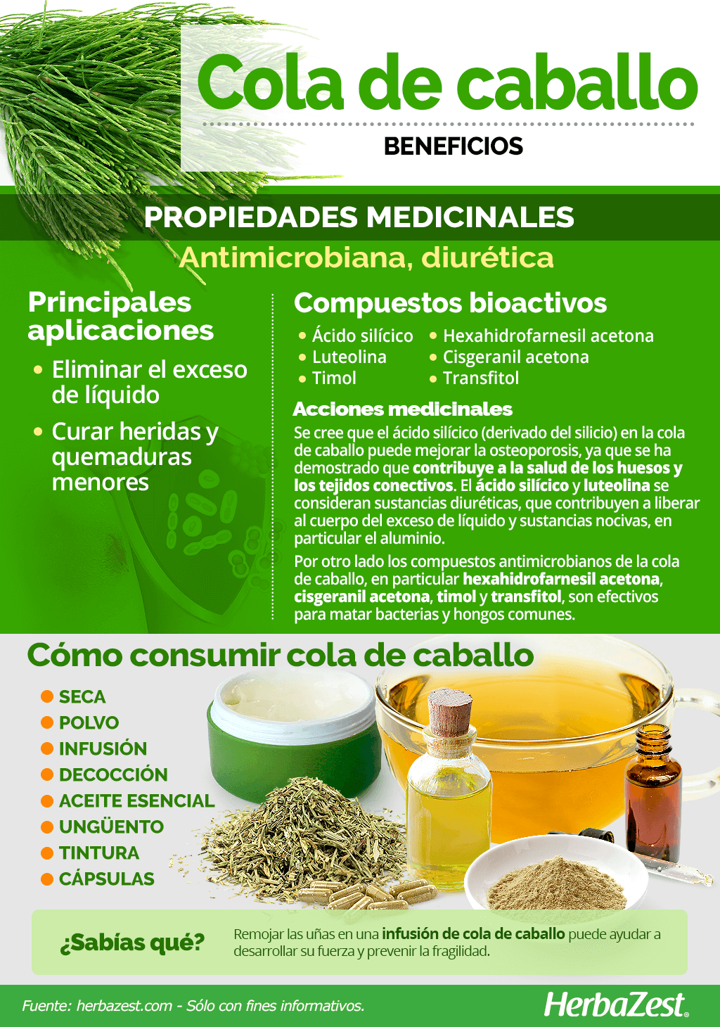 Infusión. El té de cola de caballo es una de las preparaciones más efectivas y simples para eliminar el exceso de líquidos del cuerpo. También puede ayudar a fortalecer los huesos y el tejido conectivo.