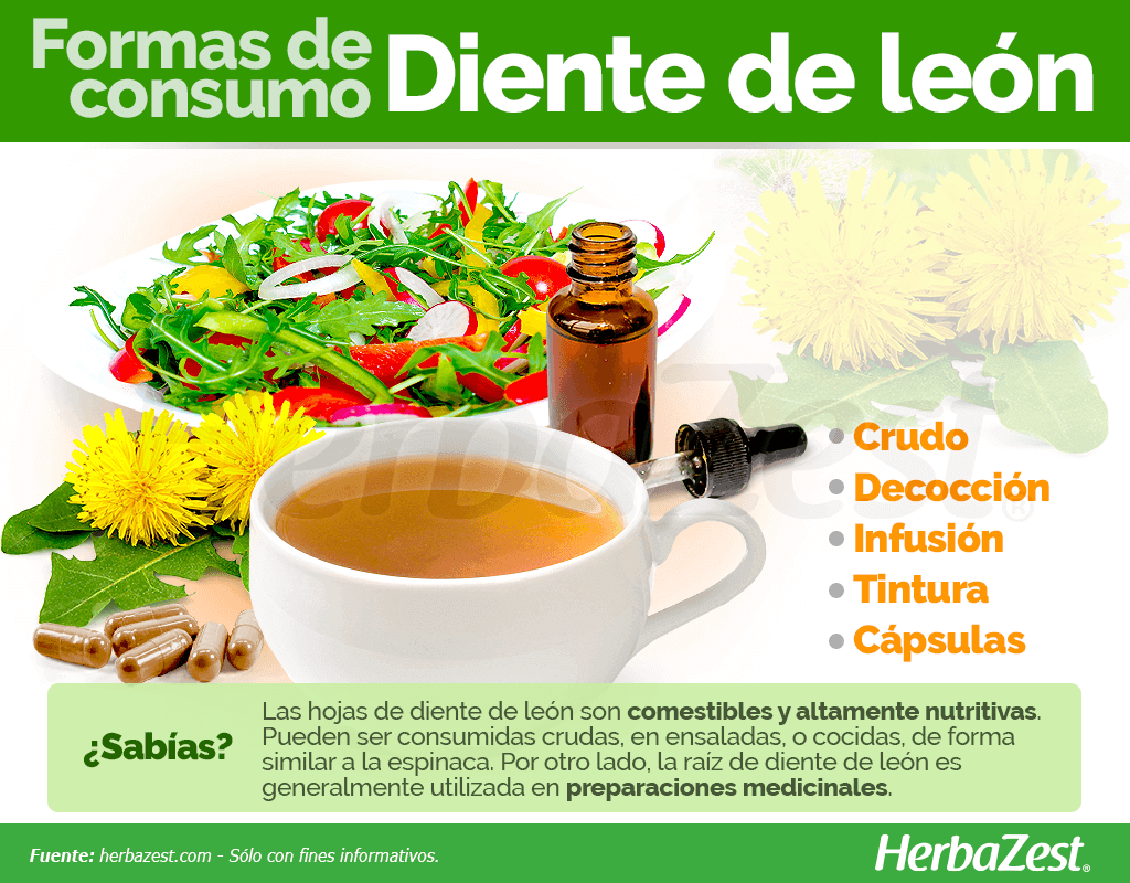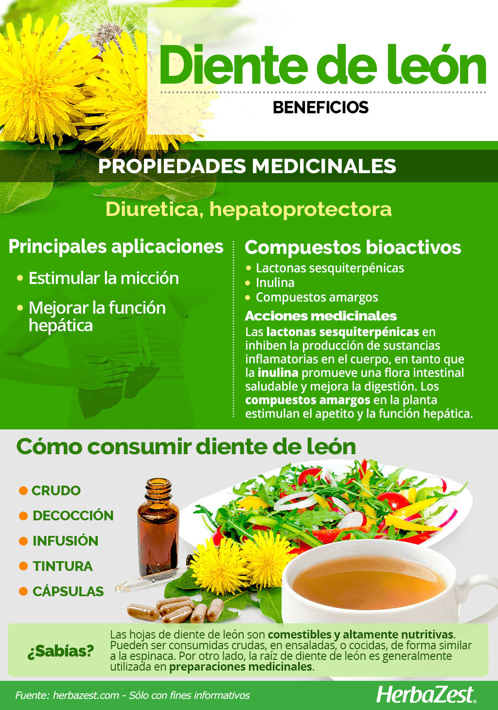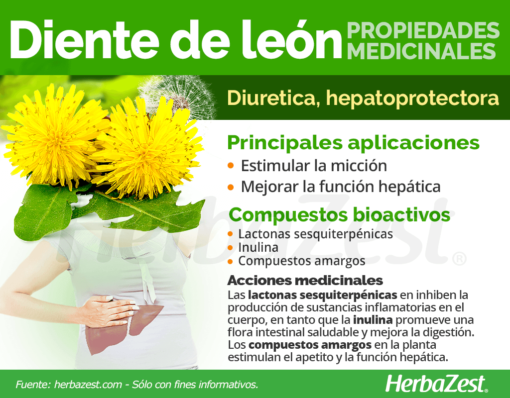 Estimular la micción. El diente de león se ha empleado popularmente para ayudar a eliminar el exceso de fluidos corporales y toxinas a través de la orina.