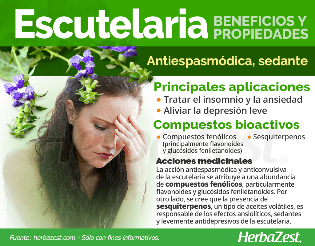 Tratar la ansiedad y el insomnio. Las efectos sedantes de la escutelaria se han utilizado durante siglos como ayuda natural para dormir, para calmar el sistema nervioso y aliviar los ataques de pánico.