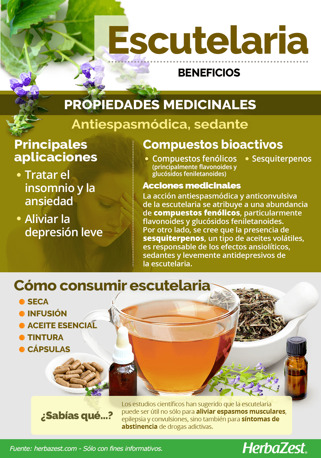 Cápsulas. La escutelaria se puede consumir en forma de cápsulas o tabletas, que vienen en dosis estandarizadas para tratar las convulsiones, la depresión leve, el insomnio y la ansiedad.