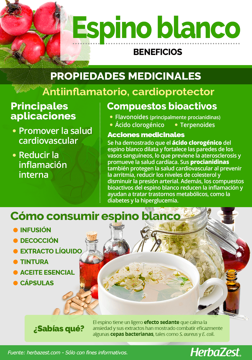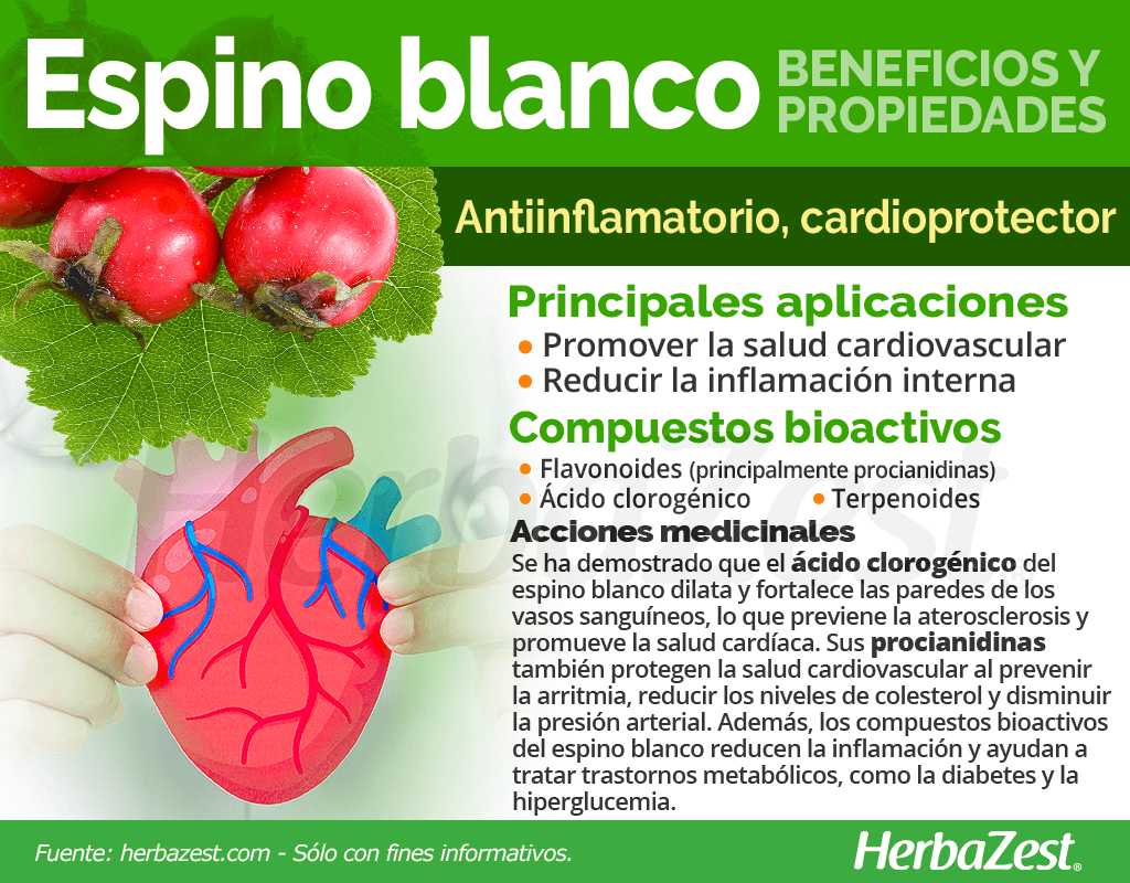 Promover la salud cardiovascular. Se ha demostrado que las propiedades cardioprotectoras y vasodilatadoras del espino blanco son eficaces para el tratamiento de enfermedades cardíacas y problemas vasculares, incluido el control de la angina de pecho, la presión arterial (tanto alta como baja), la arritmia leve, el colesterol alto y la función miocárdica.