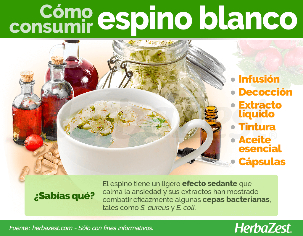 Tintura. Macerada en una base de alcohol neutro, unas gotas de tintura de espino blanco mezcladas en un vaso de agua o una infusión tibia pueden proporcionar sus efectos cardioprotectores, antiinflamatorios y calmantes.