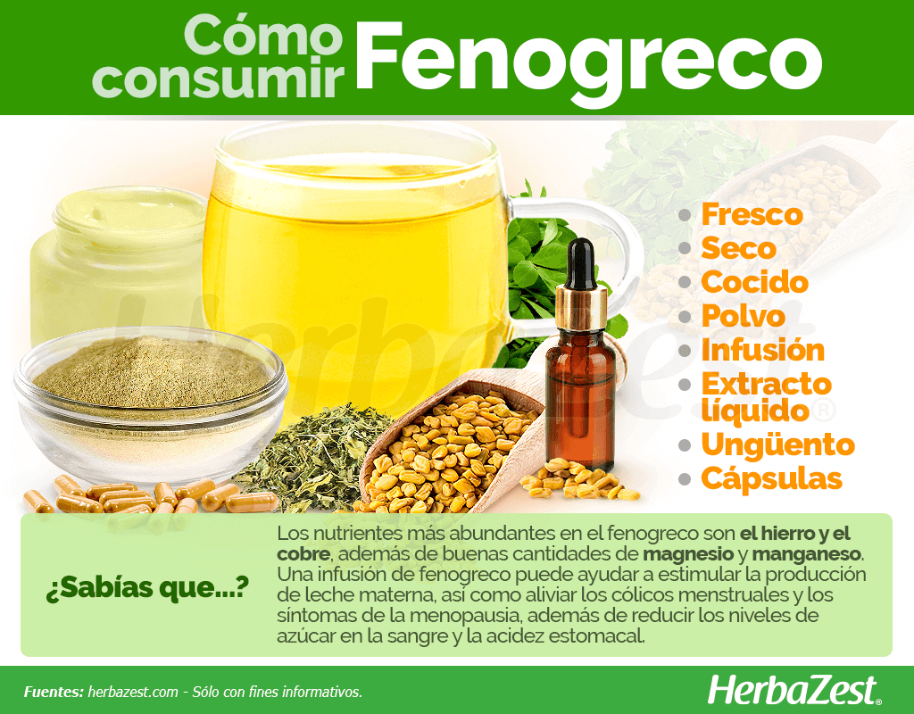 Infusión. Las semillas de fenogreco se pueden elaborar en una tisana caliente para estimular la producción de leche materna, así como para aliviar los síntomas de la menopausia, el síndrome premenstrual, el alto nivel de azúcar en la sangre y la acidez estomacal.