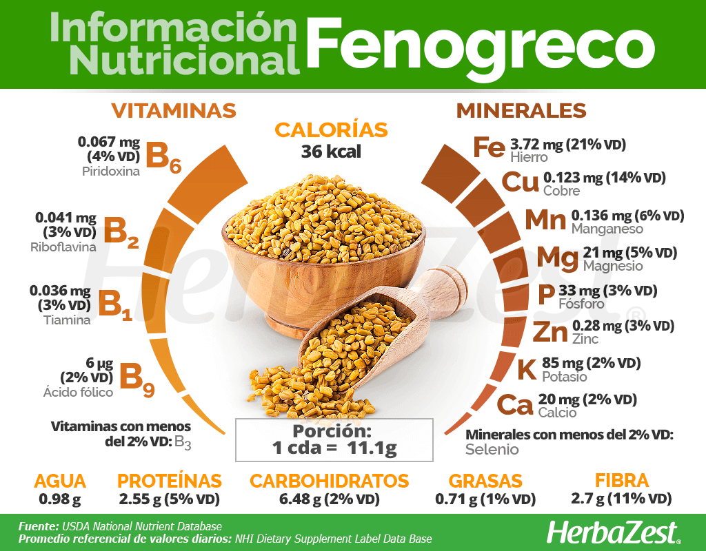 UNA CUCHARADA DE SEMILLAS DE FENOGRECO PROPORCIONA 36 CALORÍAS Y 11% DELVALOR DIARIO RECOMENDADO (VD) PARA LA FIBRA DIETÉTICA, ASÍ COMO 21 Y 14%VD DE HIERRO Y COBRE, RESPECTIVAMENTE.