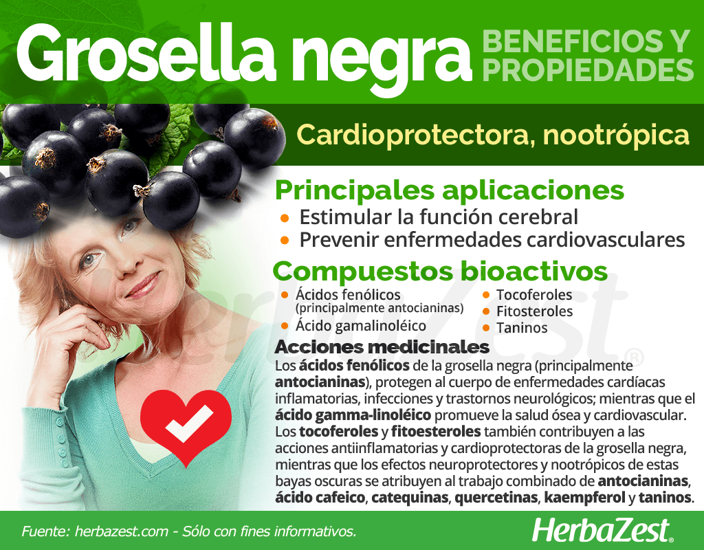 Como en la mayoría de las bayas, detrás de los efectos neuroprotectores y nootrópicos de la grosella negra se encuentra la acción combinada de potentes fitoquímicos, como antocianina, ácido cafeico, catequina, quercetina, kaempferol y taninos1.