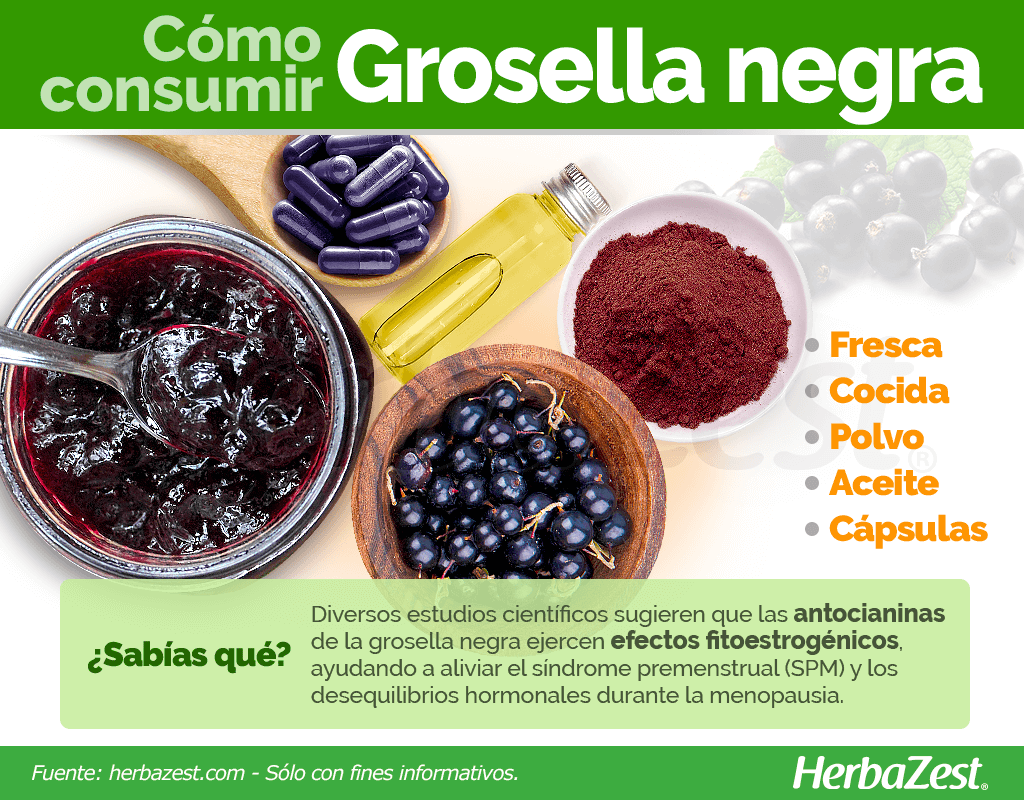 Tratar desequilibrios hormonales. La grosella negra ha demostrado ser útil para tratar los síntomas de la menopausia y aliviar el síndrome premenstrual (SPM).