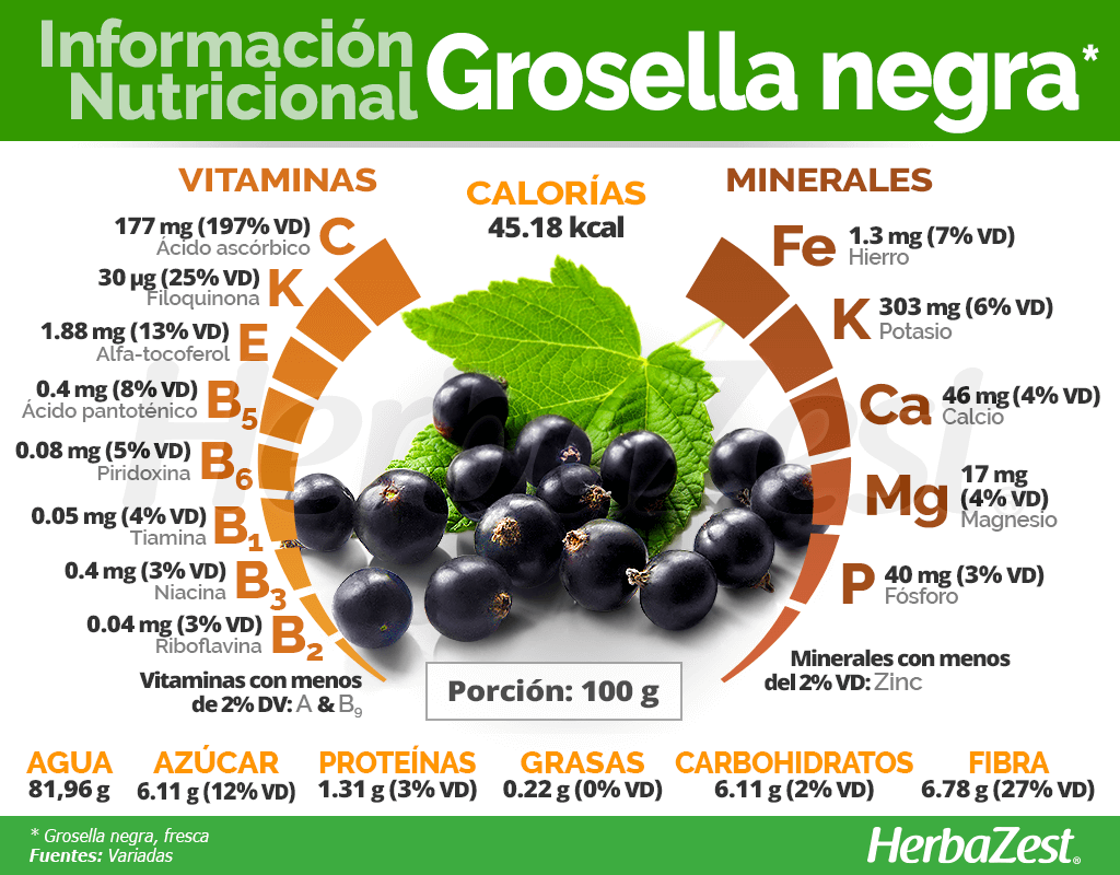 100 GRAMOS DE BAYAS FRESCAS DE GROSELLA NEGRA PROPORCIONAN 45.18 CALORÍAS,3% VD DE PROTEÍNA, 2% VD DE CARBOHIDRATOS Y 27% VD DE FIBRA DIETÉTICA.