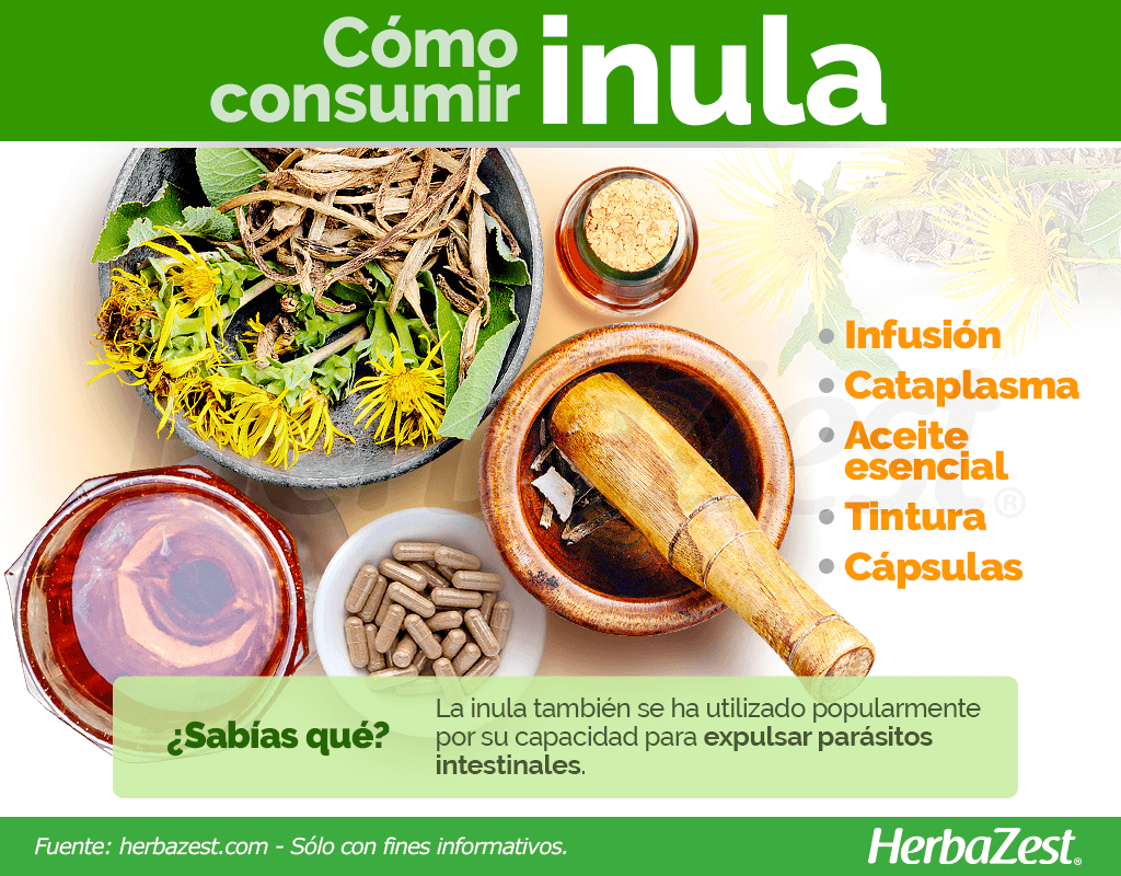 Tintura. Esta preparación concentrada se puede preparar en casa o comprar en herbolarios. Debe diluirse según las instrucciones del producto. Tradicionalmente, esta es la forma preferida de consumir inula para deshacerse de parásitos intestinales.