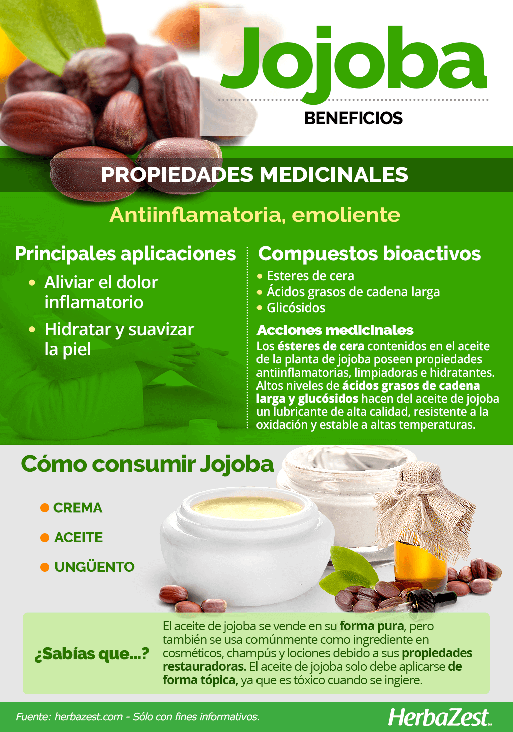 Los beneficios de la jojoba son aprovechados a través de la aplicación tópica. Cuando se utiliza externamente, las propiedades de la jojoba, principalmente antiinflamatorias y emolientes, contribuyen a mejorar la salud de la piel. La jojoba se ha usado tradicionalmente para: