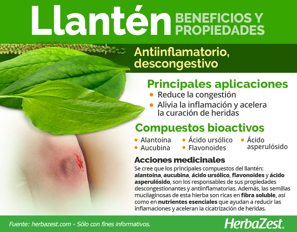 Aliviar la inflamación y acelerar la cicatrización de heridas. Las hojas de llantén se pueden aplicar sobre heridas, erupciones, mordeduras y picaduras para calmar el área afectada y acelerar la cicatrización.