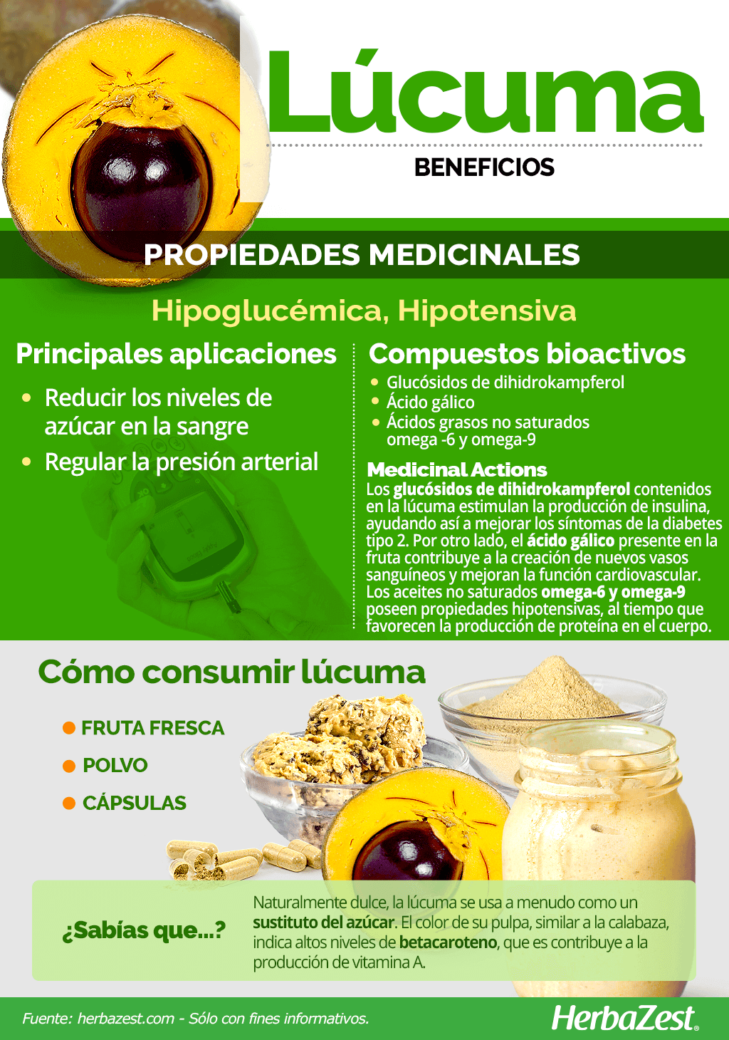 Reducir los niveles de azúcar en la sangre. A pesar de su delicado dulzor, la lúcuma no solo tiene un bajo contenido de azúcar, sino que también ayuda a controlar los niveles de glucosa en personas con diabetes.