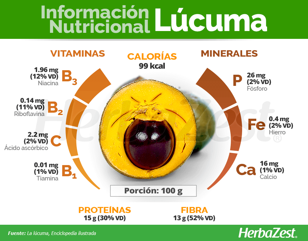 100 GRAMOS DE PULPA DE LÚCUMA PROPORCIONAN 99 CALORÍAS, ASÍ COMO 30% Y 52% DEL VALOR DIARIO DE PROTEÍNA Y FIBRA DIETÉTICA, RESPECTIVAMENTE.