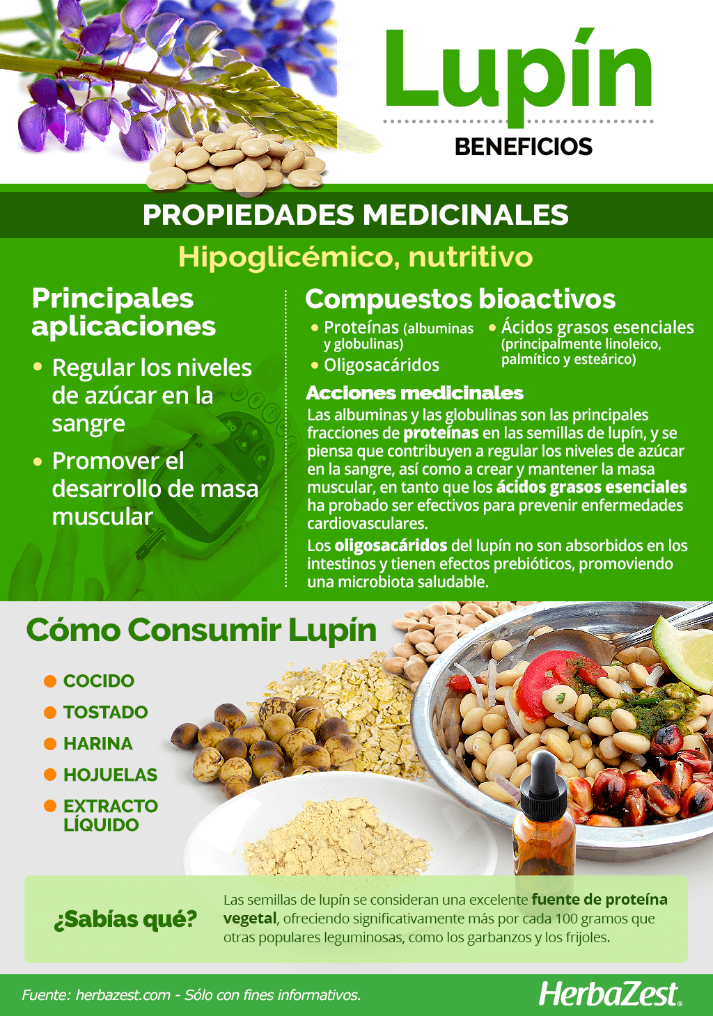 Regular los niveles de azúcar en sangre. Una variedad de estudios científicos han relacionado el consumo de lupín con niveles reducidos de glucosa en la sangre de individuos diabéticos y prediabéticos.