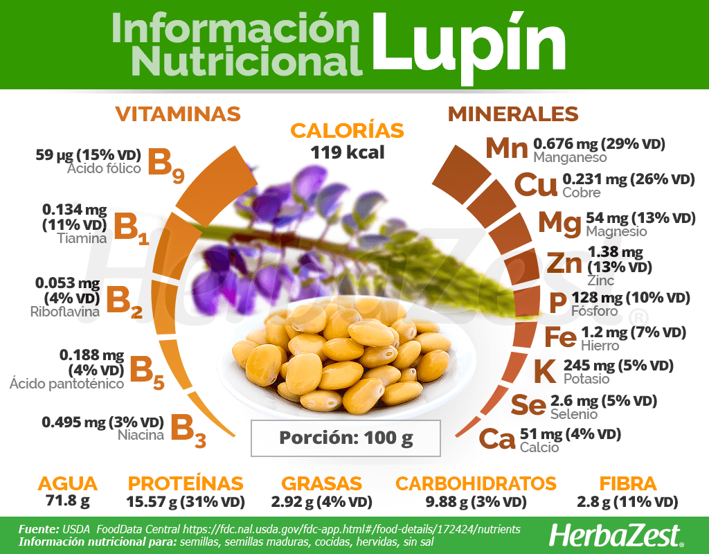 100 GRAMOS DE LUPIN COCIDO PROPORCIONAN 269 CALORÍAS, QUE ESTÁN COMPUESTAS PRINCIPALMENTE POR PROTEÍNA (29% VD), FIBRA DIETÉTICA (50% VD) Y CARBOHIDRATOS (15% VD).