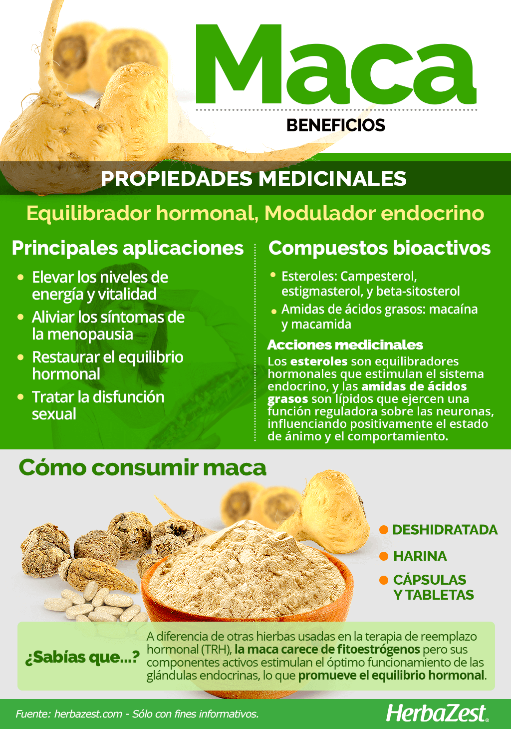 Tratar la disfunción sexual. Diversos estudio han demostrado los beneficios de la maca para la fertilidad masculina, ya que puede estimular la motilidad del esperma.2 Por otro lado, la maca también puede ayudar a las mujeres que padecen de infertilidad cuando ésta es causada por un desequilibrio hormonal.