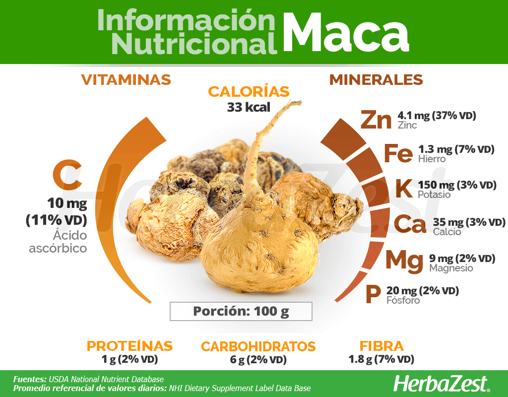 La raíz de maca peruana es una excelente fuente de zinc, un mineral esencial para el crecimiento y el desarrollo cognitivo, la salud del sistema inmune, y la descomposición adecuada de los carbohidratos, así como para los sentidos del olfato y el gusto.