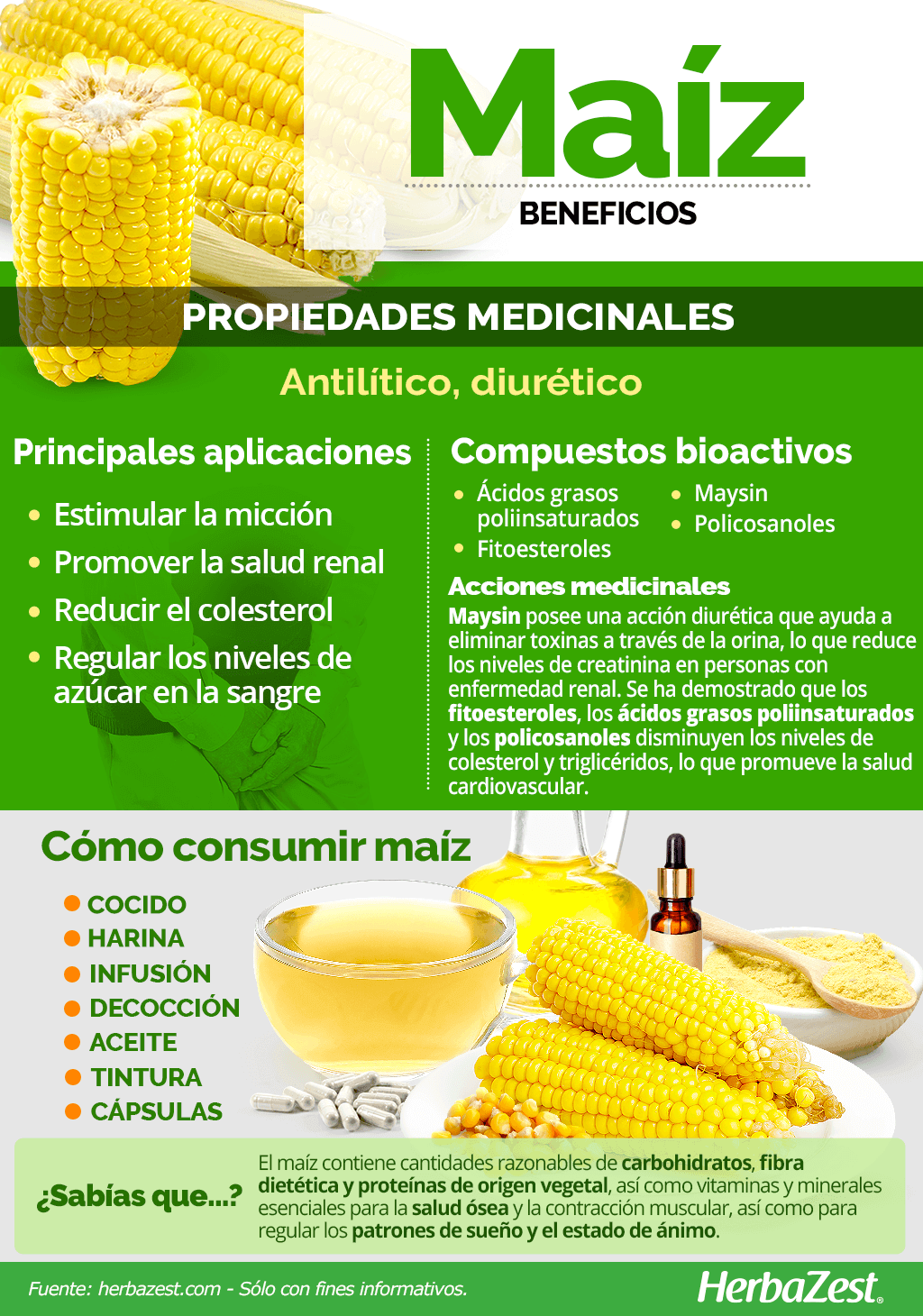 Además de sus múltiples usos culinarios, las propiedades del maíz (principalmente antilíticas y diuréticas) se han aprovechado tradicionalmente para: