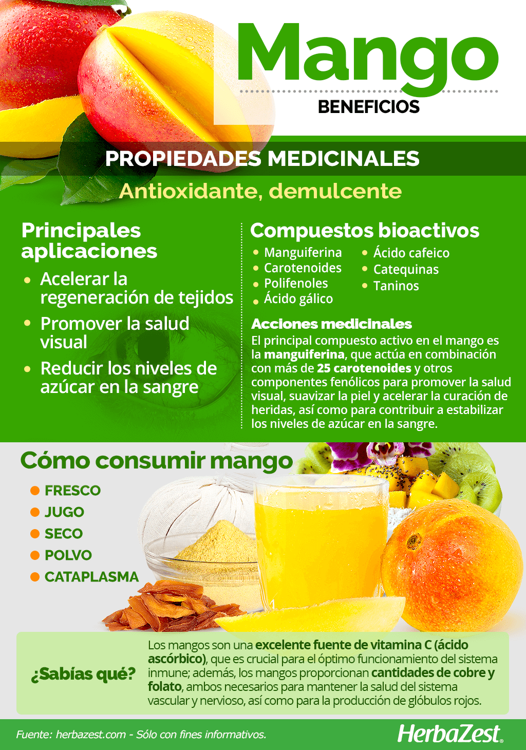 El mango contiene más de 25 carotenoides, así como polifenoles, ácido gálico, ácido cafeico, catequinas y taninos. La acción combinada de estos compuestos promueve la salud ocular y la cicatrización de heridas, además de contribuir a estabilizar los niveles de azúcar en sangre.2