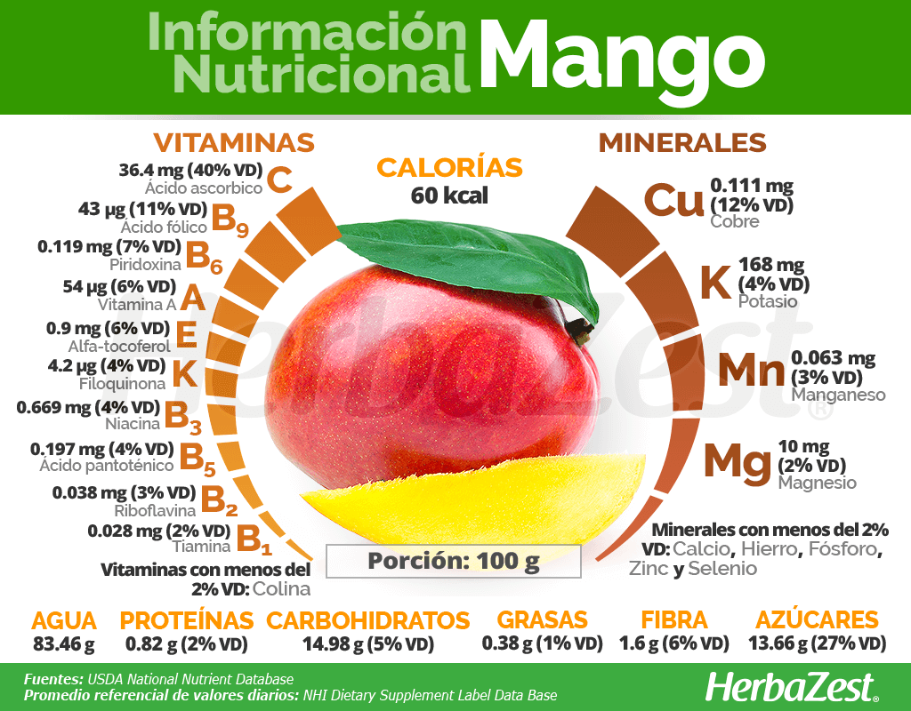 100 gramos de mango aportan 60 calorías, así como 5% y 6% del valor diario de carbohidratos y fibra dietética, respectivamente.