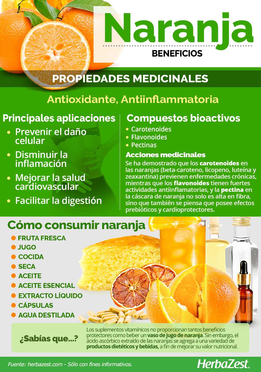 Las naranjas tienen una gran variedad de usos culinarios. Su jugo se puede agregar a salsas y también usarse como ingrediente para muchos platos salados y dulces. Si bien los beneficios de la naranja se obtienen de manera más efectiva al consumirla en su estado natural, existen varias preparaciones medicinales que pueden utilizarse para aprovechar las propiedades de esta fruta cítrica.