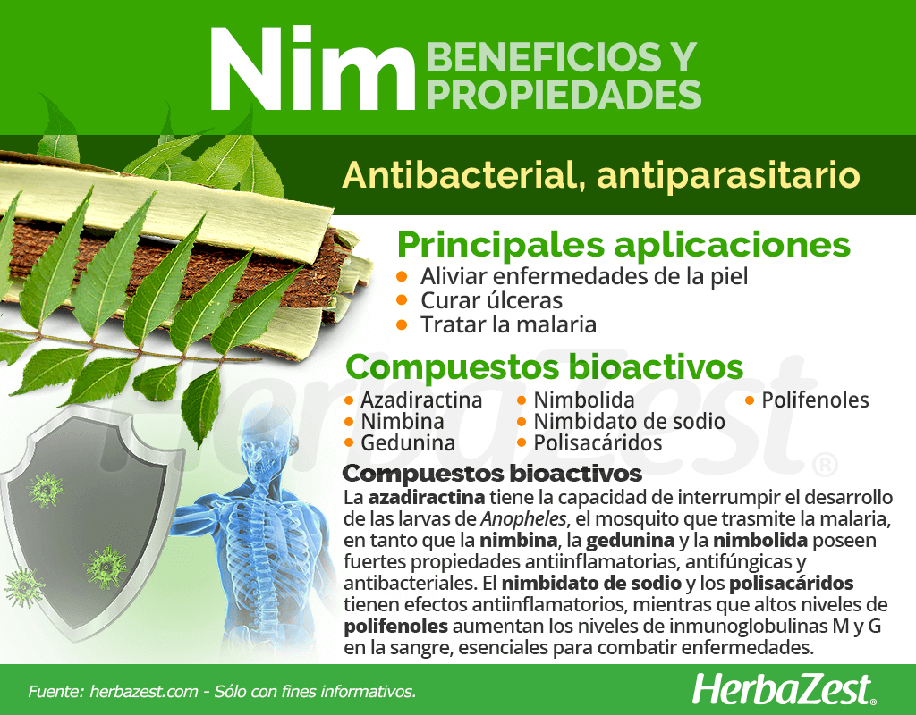 - Principios activos Azadiractina, nimbina, gedunina, nimbolida, nimbidato de sodio, polisacáridos, y polifenoles