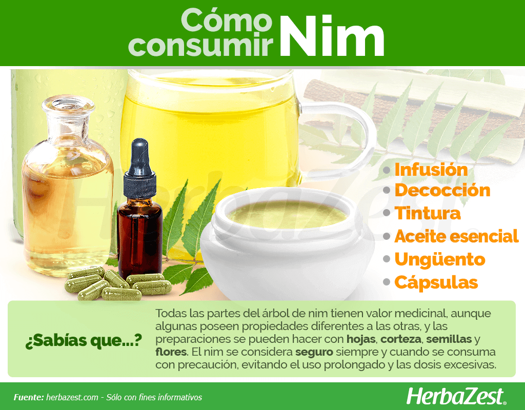 Infusión. El té de nim, hecho con las hojas de este árbol, es una de las formas más populares de consumo. Esta preparación proporciona propiedades antibacterianas y antiinflamatorias, que sirven para calmar y prevenir úlceras estomacales.
