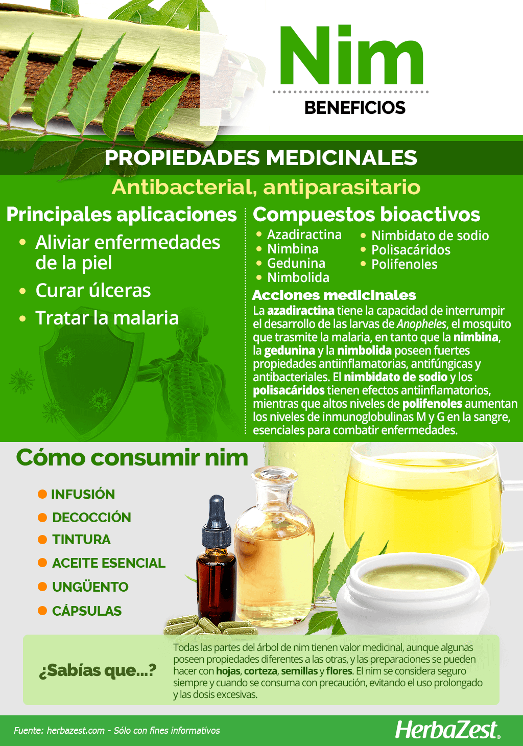 Aliviar enfermedades de la piel. Debido a sus propiedades antiinflamatorias, antibacterianas y antifúngicas, el nim se usa para curar heridas menores o afecciones dermatológicas, como el eczema.